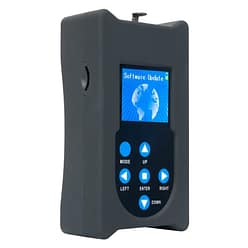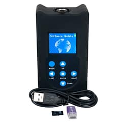 The CUE Software Uploader™ is a battery powered hand held software uploader device used to update Elation compatible lighting fixtures. Easily upload a software update to an Elation lighting fixture by connecting the uploader to the fixture using a 3pin DMX cable (not included). Elation software updates (not included) are stored on a MICRO SD card (included) and inserted into the uploader. CUE Software Uploader™ features an LCD display, 6 button control panel, a MICRO SD card slot, a 3pin XLR DMX output, an On/Off switch, and includes battery, USB cable, USB to MICRO SD card adapter, and blank MICRO SD card.