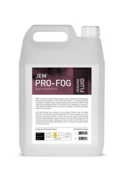 JEM™ Pro-Fog Fluid, Quick Dissipating is a water-based, fast dissipating fog fluid specially designed for use in JEM fog machines. In a studio or theatre environment, a lighter, faster dispersing fog is often preferred. JEM Pro-Fog Fluid, Quick Dissipating offers a less dense effect compared to the benchmark JEM Pro-Fog Fluid and is therefore less likely to interfere with video and film camera focusing.